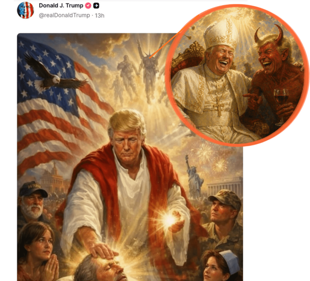 President Donald Trump posted an AI-generated image depicting himself late Sunday as a Jesus-like character healing a sick man, but the image included one not-so-subtle change from the original posted months ago by a MAGA fan – swapping out a U.S. soldier for a horned creature with wings. — Yahoo News