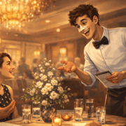 Forget that. Let’s just go to the next lovely lady. Would you like to start with a drink instead of water first, ma’am? You look parched. Seriously. Whatever drink you like. Don’t be shy. I’m the waiter, I’m not your fitness instructor. Order whatever. I won’t tell. You look like you’re in good shape anyways. You guys all do. Beautiful table. Have a cheat day, ma’am. You deserve it. Live a little. We have soda, tea, coffee, anything. Anything you want. Ask and you shall receive. Are you thinking? What’s wrong? Just order. I’m here to take orders. Order me around. I like it. Gets me going. Please. It’s cheat day. Let’s celebrate. It’ll be our secret. I beg you. Decide. Now. Live. Laugh. Love. Three. Two. One. Tick. Tick. Tick. BOOM. Time’s up. What’ll it be? On the house. For my new friend.