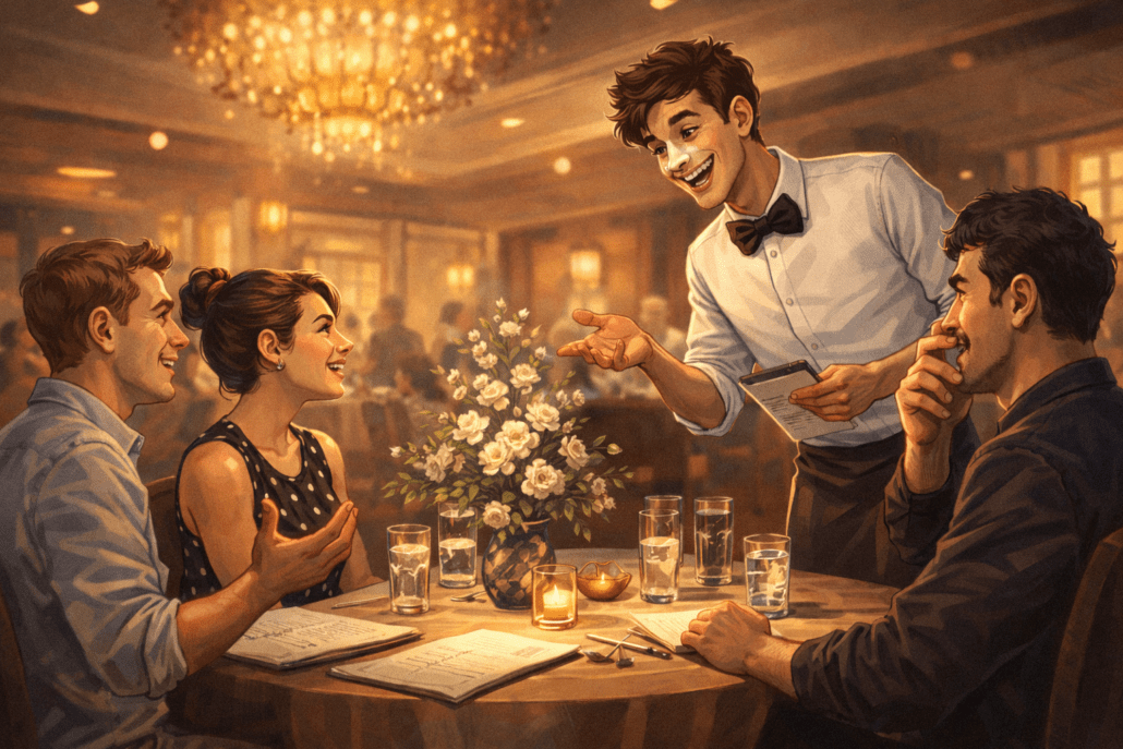 Hello! Tibb, party of 4? Follow me. Right this way. Here’s your table. Let you guys settle in. There you go. Good good good. It’s nice, right? I love the centerpieces here. Don’t know where they get them. I’ll have to ask. Always meant to. I’ll let you know. And the light fixtures too. Love them. Love the lighting. Probably worth a fortune. Yeah. Sturdy table. Cool carpet. Big, uh, walls. Never noticed the ceiling before. Way up there. Look at that. Wow. What was I… ? Oh! Right! I’m Jom, I’ll be your waiter this evening.