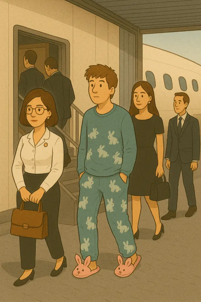 It’s time to bring humanity back to air travel, one tasteful ensemble at a time, even when the system is buckling under delays, cancellations, shrinking seats, and the occasional passenger unleashing their inner velociraptor.