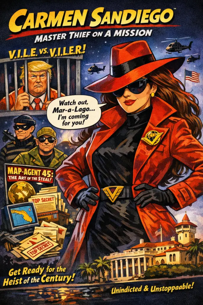 I, Carmen Sandiego in conjunction with Broderbund Software, retain certain intellectual property claims over the concept of globe-trotting villainy involving the theatrical theft of both vague national values and specific cultural assets. Consider this a courtesy notice to cease and desist any trademarked international heists or crimes.