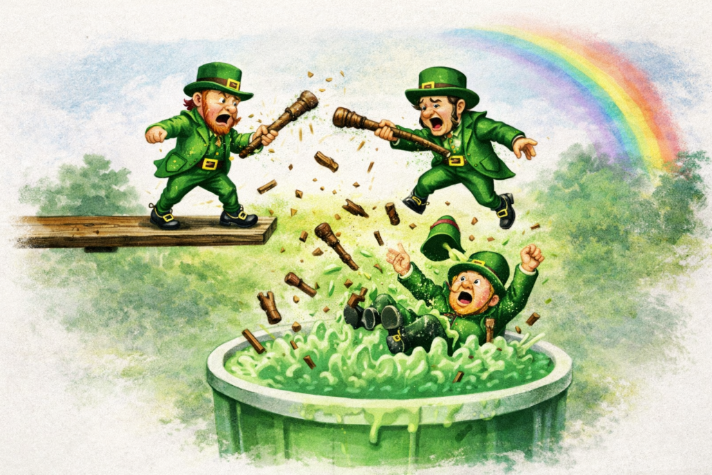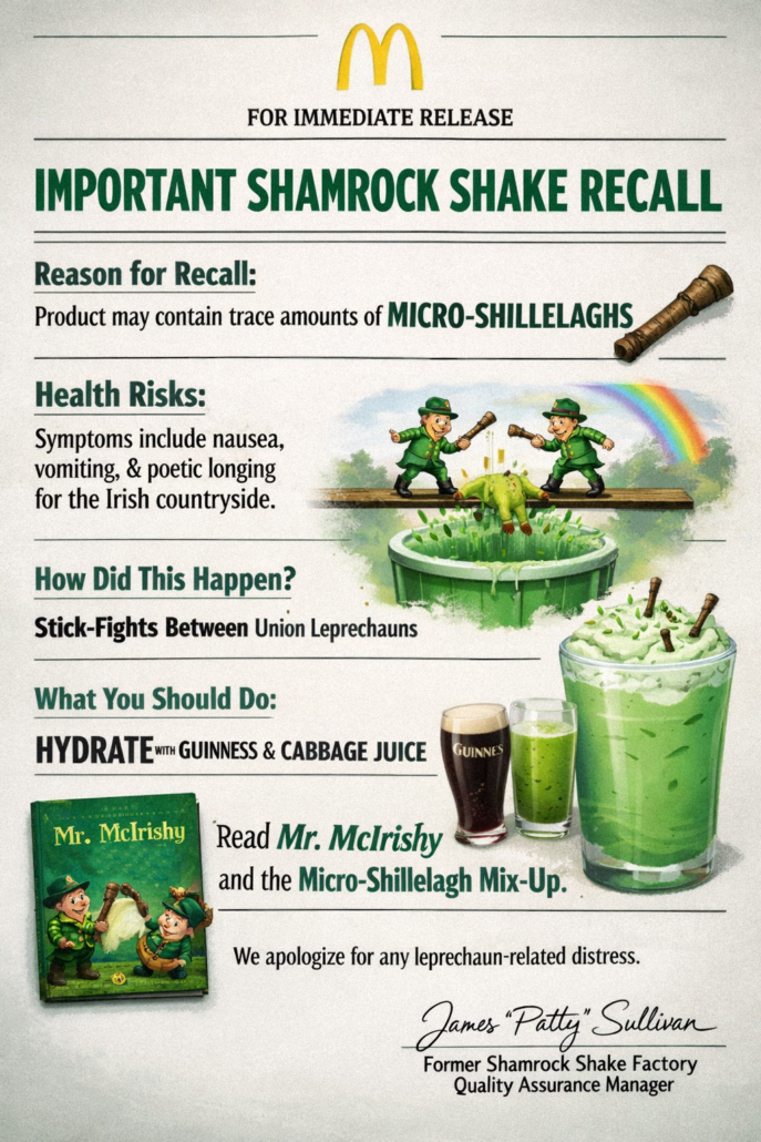 If you have drunk a Shamrock Shake in the last 24-48 hours, hydrate with Guinness and cabbage juice and give a relative the silent treatment while never explaining directly what they did wrong. If you have a hard time explaining your family’s sudden dip in Shamrock Shake consumption to your little ones, you can buy our children’s book: Mr. McIrishy and the Micro-Shillelagh Mix-Up. It explains the situation colorfully, like Roald Dahl’s Charlie and the Chocolate Factory, while lightly touching on the tremendous number of leprechaun deaths and the recent scientific findings that micro-shillelaghs were found in people’s brain matter and testicles.