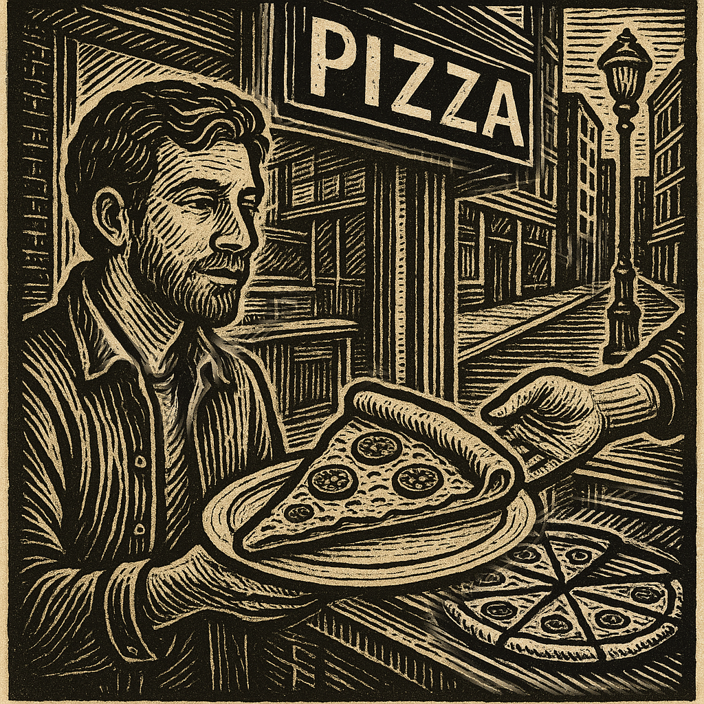 Just as the journey began, he was approached by a friend from years ago who went by the name “Big Gus.” His energy was large and his appetite was legendary. The old man knew Big Gus would set his sights on the slice as soon as the smell cemented itself in Big Gus’s untrimmed nostrils.