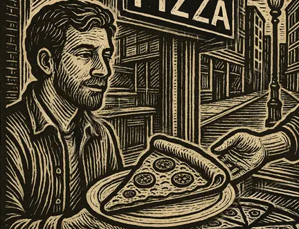Just as the journey began, he was approached by a friend from years ago who went by the name “Big Gus.” His energy was large and his appetite was legendary. The old man knew Big Gus would set his sights on the slice as soon as the smell cemented itself in Big Gus’s untrimmed nostrils.