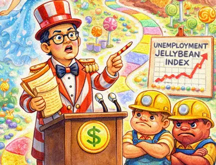 Contrast this with the Gumdrop Mountains, where resource extraction continues at a brisk pace despite tight policy. The mountains are rich in natural gumdrops, and global demand has remained resilient. Yet even there, cracks are emerging. High rates have encouraged short-term munches over long-term savoring. Operators strip mine the juiciest deposits and underinvest in sustainable cultivation. The near-term output looks robust, but the long-run productive capacity of the gumdrop base is quietly eroding. This is not the “soft landing” the Mint promised; it is a slow descent into structurally lower potential output and less cavities, which nobody wants.