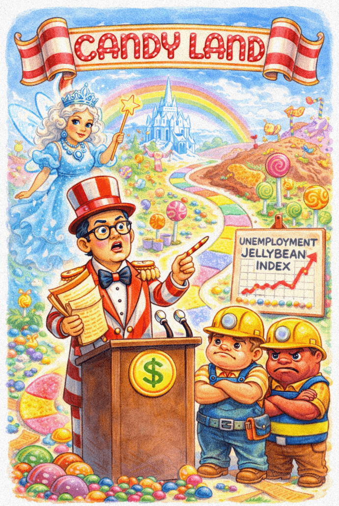 As a respected professor of Snackcro-economics at Froston University, I take my position of authority very seriously. I feel it is my duty to give an honest and serious assessment of the state of the economy in Candy Land. Consider first the state of Candy Land’s labor market. While on paper, the Unemployment Jellybean Index remains low, we can all look and guess how many unemployed there are, more than we think!
